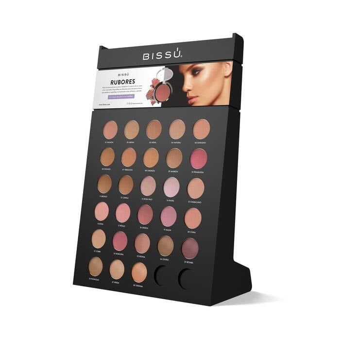 Mostrador de PVC espumado negro que reúne las 28 pastillas con los diferentes tonos de rubor Bissú. Incluye ficha con especificaciones del producto. Todos nuestros probadores son ideales
